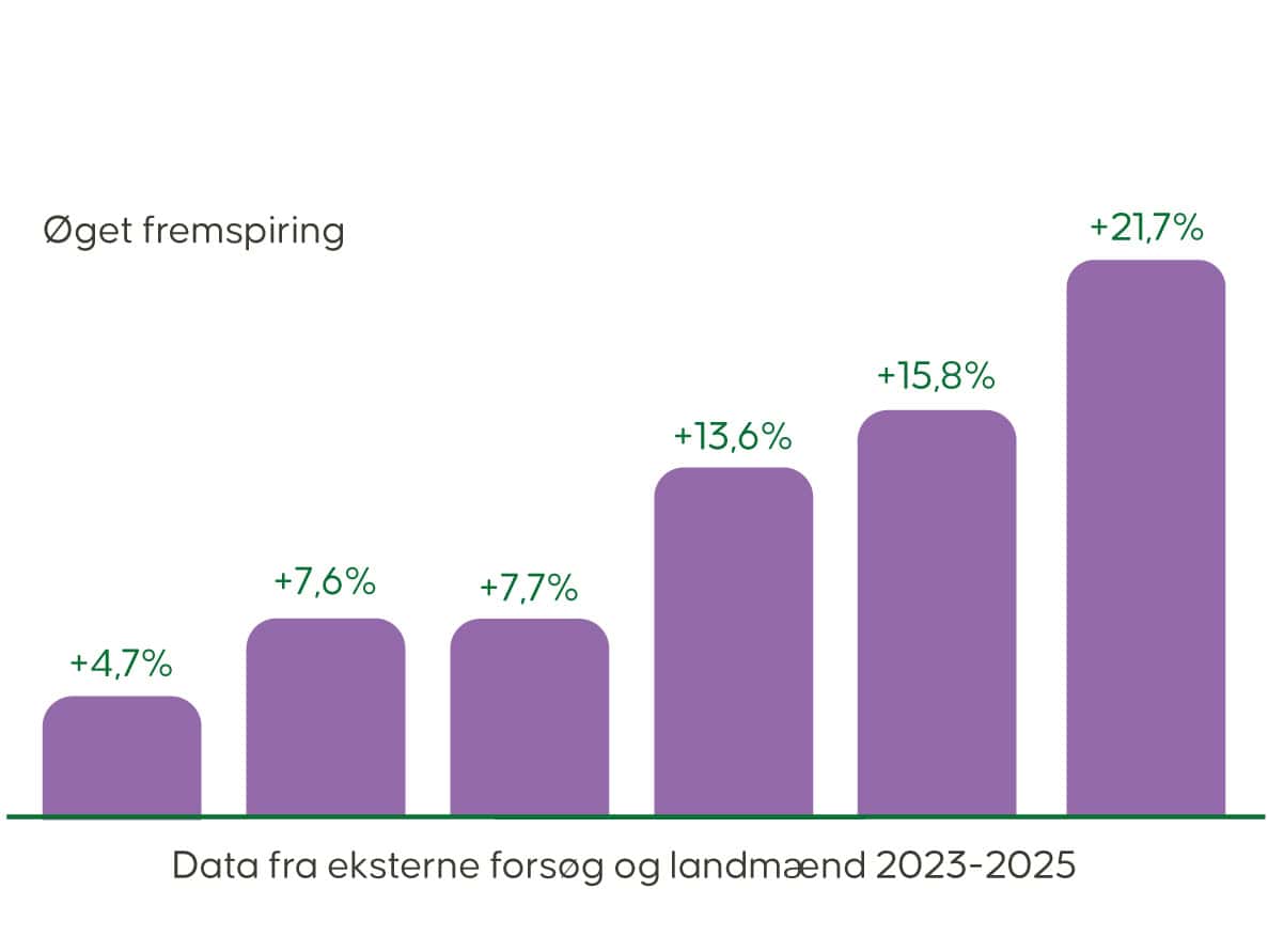 Vores biostimulanter øger tilgængeligheden af jordens næringsstoffer i plantens tidlige vækstfase. Det har en positiv effekt på fremspiringen af både vinterhvede og vårhvede, og giver flere planter fra den samme såsæd.